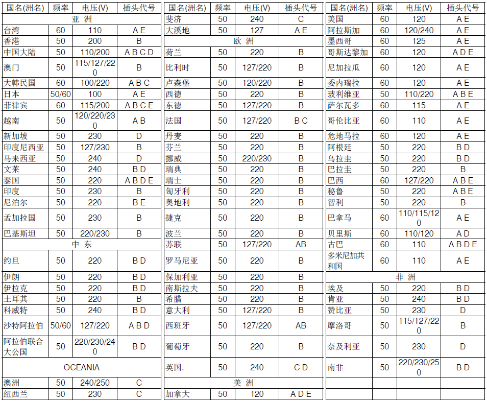 適配器(Adaptor)通常需要藉由一條電源線來提供其所需的電力,而電源線連接適配器那一端的對應(yīng)頭可參考適配器規(guī)格書中的AC INLET型號來選擇;至于連接電源插座那一端的插頭或電壓,會因不同的國家而有不同,您可參考以下各主要商旅國家電壓及插頭對照表來選擇。 注意事項: 1.本插頭組不能轉(zhuǎn)換電壓 2.本對照表雖依國家、電壓區(qū)分插頭,但仍有相同國家因地域不同,電壓及插頭形式不同,因此在使用之前,請先確認(rèn)。
