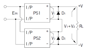(2)增加輸出電壓(電流不變),電源輸出端需加并二極管,以防止起動時造成電源內部損壞,二極管耐壓需大于V1+V2(如下圖),瞬間電流需大于額定輸出電流。