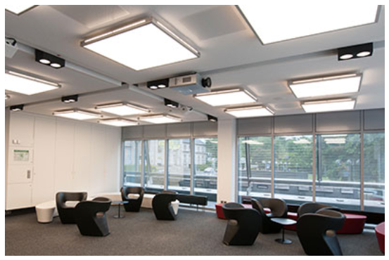 應用范例:辦公室使用20盞LED平板燈,搭配 LCM-40DA。辦公室有3個不同區域,設計者可透過DALI控制器將這20盞燈分配到3個不同群組。設定容易也易于未來變更。